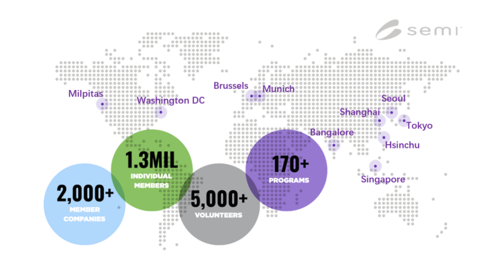 目前,SEMI 已经连接了 2000 多家会员企业和全球 130 万专业人士来共同推进电子制造行业进步,在全球有十几个驻点,遍布美国、亚洲(新竹、首尔、上海、新加坡、东京)、印度、欧洲柏林和布鲁塞尔。主办的SEMICON展会有SEMICON China、SEMICON SEA、SEMICON Japan、SEMICON WEST、SEMICON Taiwan、SEMICON Europa、SEMICON Korea 等。