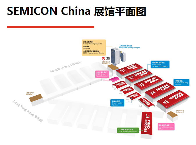 2024 SEMICON China 开幕在即此次设置了四个主题专区:IC 制造专区、化合物半导体专区、SEMI 中国英才计划专区、芯车会专区。展馆分布在 N1-N5、T01-T7、E3,还有更多盛大活动和同期会议与您共享半导体产业盛宴:开幕主题演讲、英才计划领袖峰会、半导体制造技术产业链论坛、创新投资高峰论坛、功率及化合物半导体国际论坛、中国元宇宙显示大会-硅基显示等。