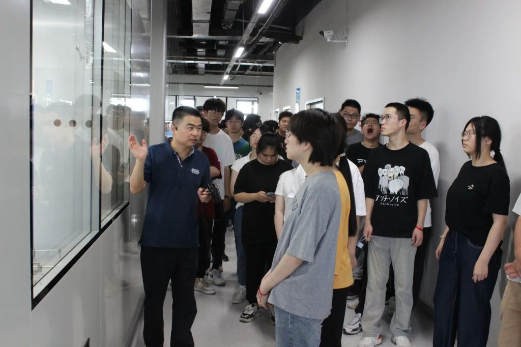 随后,制造中心半导体生产负责人杨帅邦带领学生们来到半导体制造车间,现场观摩生产过程、详细为同学们讲解半导体业务及产品相关设备的使用场景。