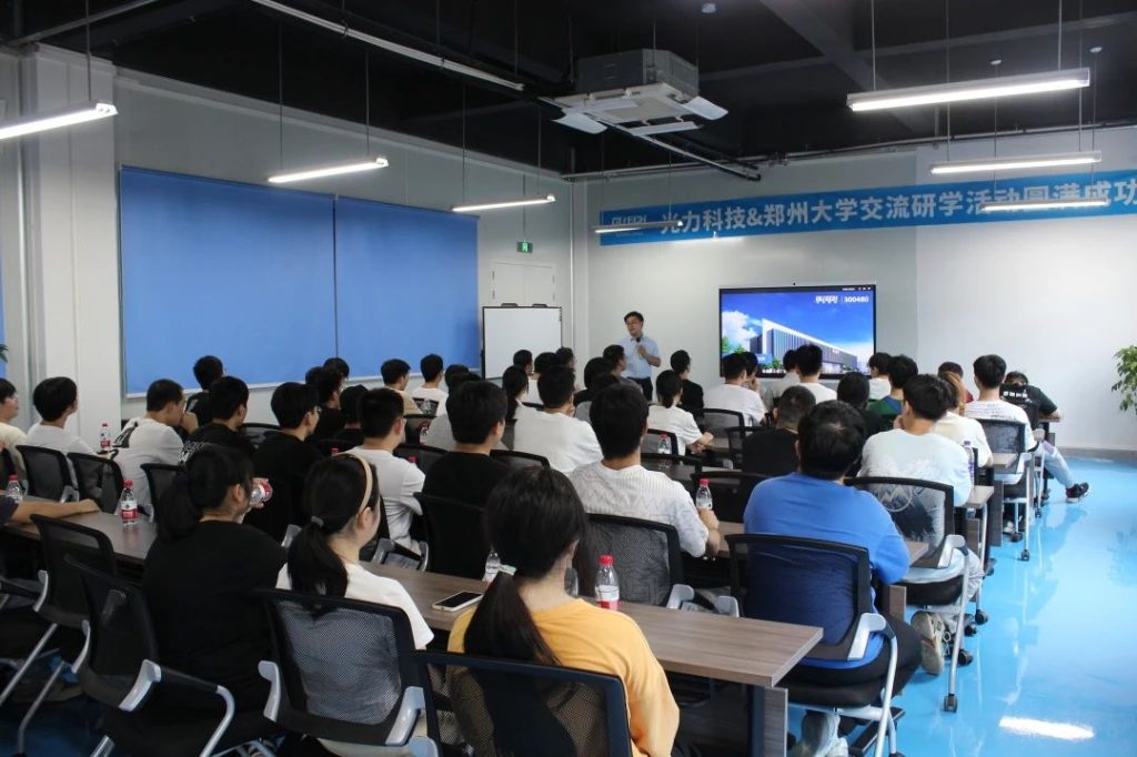 7月18日,郑州大学电气学院170余名学生到NG大舞台 航空港厂区展研学参观活动。NG大舞台 行政人资中心总监吴国力、制造中心李轲主任、李宝珠部长、半导体生产负责人杨帅邦及人力资源部HR热情接待。