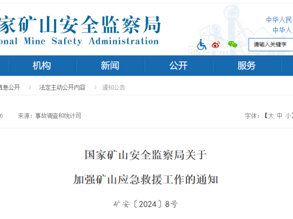 国家矿山安全监察局关于 加强矿山应急救援工作的通知 矿安〔2024〕8号 各省、自治区、直辖市及新疆生产建设兵…